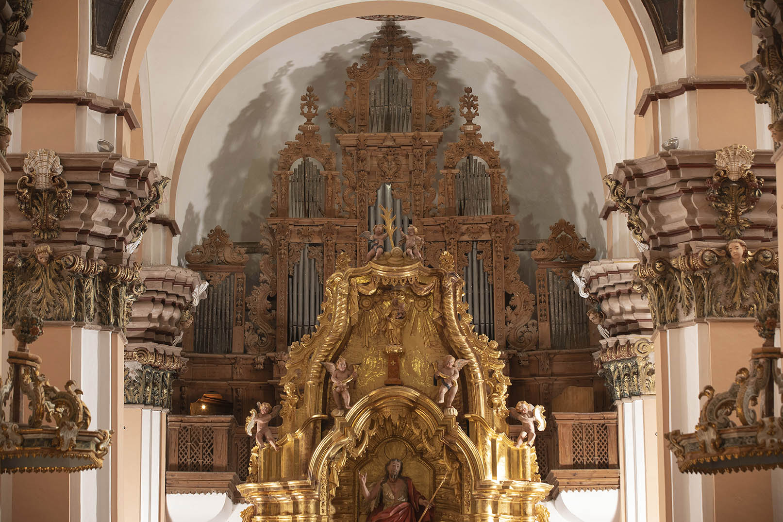San Blas aparece representado con báculo y mitra, atributos de obispo pues él lo fue de Tebaste. En la parte superior del arco que encierra la imagen encontramos una inscripción con el año "1898". San Antonio Abad, protector del ganado, se presenta llevando sayal con capucha, cayado y en compañía de varios animales. San Cristóbal, protector de los viajeros, se representa avanzando por un río ayudado por un palo y llevando al niño Jesús sobre el hombro. San Juan Bautista se representa en una escena que retrata el bautizo.